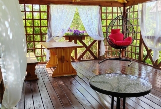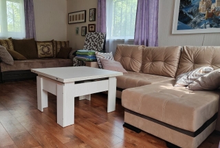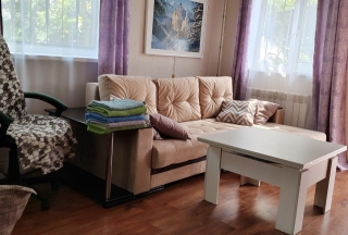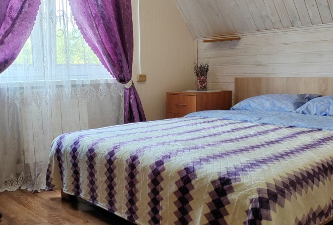 В доме два этажа. На первом расположена кухня со всеми кухонными принадлежностями, санузел, комната на 4 спальных места. На втором этаже находится две спальни с двумя двуспальными кроватями. В доме есть все для комфортного проживания.